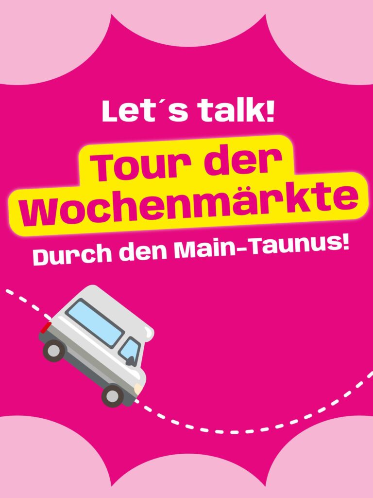 Im Rahmen unserer „Tour der Wochenmärkte“ machen wir Halt im Main-Taunus-Kreis. Egal, ob ihr konkrete Fragen habt, Anregungen für eure Stadt loswerden wollt oder einfach nur auf einen kurzen Plausch vorbeischauen mögt: Jeder ist herzlich willkommen!